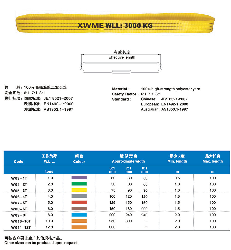 合成纖維吊裝帶(以下簡稱吊裝帶)為軟吊裝帶,采用非金屬原料,屬吊裝行業(yè)中鋼繩、鏈條的換代產(chǎn)品,比同類金屬繩相對輕便。能解決實際吊裝過程中大噸位、小吊裝空間的吊裝難題。吊裝帶有輕便、使用壽命長、減震性能好、不導(dǎo)電、不易腐蝕、保護被吊物品不被刮傷等特點。多次的斷裂試驗表明,吊裝帶相對于金屬繩鏈產(chǎn)生的反向傷害幾乎為零。吊裝帶采用國際標(biāo)準(zhǔn)色來區(qū)分承載噸位,在使用過程中,吊帶裝上的標(biāo)簽?zāi)p后,可能過吊裝帶外套的顏色來識別承重重量。合成纖維吊裝帶在國際上起步較早,至今已有著五十多年的應(yīng)用歷史,在經(jīng)過二十多年的國內(nèi)推廣應(yīng)用,以其獨有的顯著優(yōu)勢,早許多行業(yè)正逐步替代鋼絲繩索具和鏈條索具。