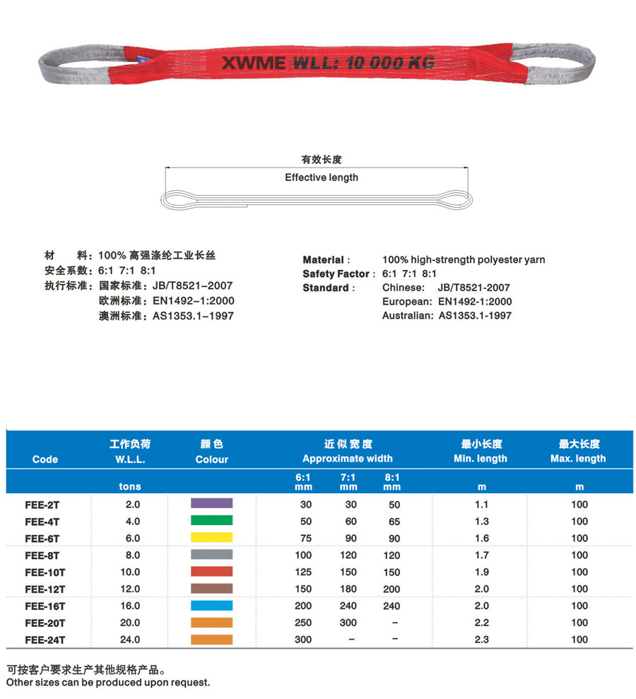 合成纖維吊裝帶(以下簡(jiǎn)稱吊裝帶)為軟吊裝帶,采用非金屬原料,屬吊裝行業(yè)中鋼繩、鏈條的換代產(chǎn)品,比同類金屬繩相對(duì)輕便。能解決實(shí)際吊裝過程中大噸位、小吊裝空間的吊裝難題。吊裝帶有輕便、使用壽命長(zhǎng)、減震性能好、不導(dǎo)電、不易腐蝕、保護(hù)被吊物品不被刮傷等特點(diǎn)。多次的斷裂試驗(yàn)表明,吊裝帶相對(duì)于金屬繩鏈產(chǎn)生的反向傷害幾乎為零。吊裝帶采用國(guó)際標(biāo)準(zhǔn)色來區(qū)分承載噸位,在使用過程中,吊帶裝上的標(biāo)簽?zāi)p后,可能過吊裝帶外套的顏色來識(shí)別承重重量。合成纖維吊裝帶在國(guó)際上起步較早,至今已有著五十多年的應(yīng)用歷史,在經(jīng)過二十多年的國(guó)內(nèi)推廣應(yīng)用,以其獨(dú)有的顯著優(yōu)勢(shì),早許多行業(yè)正逐步替代鋼絲繩索具和鏈條索具。