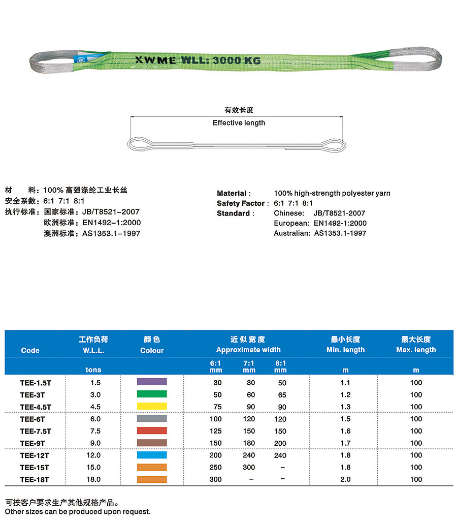 合成纖維吊裝帶(以下簡(jiǎn)稱(chēng)吊裝帶)為軟吊裝帶,采用非金屬原料,屬吊裝行業(yè)中鋼繩、鏈條的換代產(chǎn)品,比同類(lèi)金屬繩相對(duì)輕便。能解決實(shí)際吊裝過(guò)程中大噸位、小吊裝空間的吊裝難題。吊裝帶有輕便、使用壽命長(zhǎng)、減震性能好、不導(dǎo)電、不易腐蝕、保護(hù)被吊物品不被刮傷等特點(diǎn)。多次的斷裂試驗(yàn)表明,吊裝帶相對(duì)于金屬繩鏈產(chǎn)生的反向傷害幾乎為零。吊裝帶采用國(guó)際標(biāo)準(zhǔn)色來(lái)區(qū)分承載噸位,在使用過(guò)程中,吊帶裝上的標(biāo)簽?zāi)p后,可能過(guò)吊裝帶外套的顏色來(lái)識(shí)別承重重量。合成纖維吊裝帶在國(guó)際上起步較早,至今已有著五十多年的應(yīng)用歷史,在經(jīng)過(guò)二十多年的國(guó)內(nèi)推廣應(yīng)用,以其獨(dú)有的顯著優(yōu)勢(shì),早許多行業(yè)正逐步替代鋼絲繩索具和鏈條索具。
