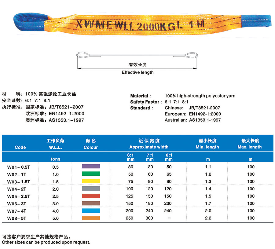 合成纖維吊裝帶(以下簡(jiǎn)稱吊裝帶)為軟吊裝帶,采用非金屬原料,屬吊裝行業(yè)中鋼繩、鏈條的換代產(chǎn)品,比同類(lèi)金屬繩相對(duì)輕便。能解決實(shí)際吊裝過(guò)程中大噸位、小吊裝空間的吊裝難題。吊裝帶有輕便、使用壽命長(zhǎng)、減震性能好、不導(dǎo)電、不易腐蝕、保護(hù)被吊物品不被刮傷等特點(diǎn)。多次的斷裂試驗(yàn)表明,吊裝帶相對(duì)于金屬繩鏈產(chǎn)生的反向傷害幾乎為零。吊裝帶采用國(guó)際標(biāo)準(zhǔn)色來(lái)區(qū)分承載噸位,在使用過(guò)程中,吊帶裝上的標(biāo)簽?zāi)p后,可能過(guò)吊裝帶外套的顏色來(lái)識(shí)別承重重量。合成纖維吊裝帶在國(guó)際上起步較早,至今已有著五十多年的應(yīng)用歷史,在經(jīng)過(guò)二十多年的國(guó)內(nèi)推廣應(yīng)用,以其獨(dú)有的顯著優(yōu)勢(shì),早許多行業(yè)正逐步替代鋼絲繩索具和鏈條索具。