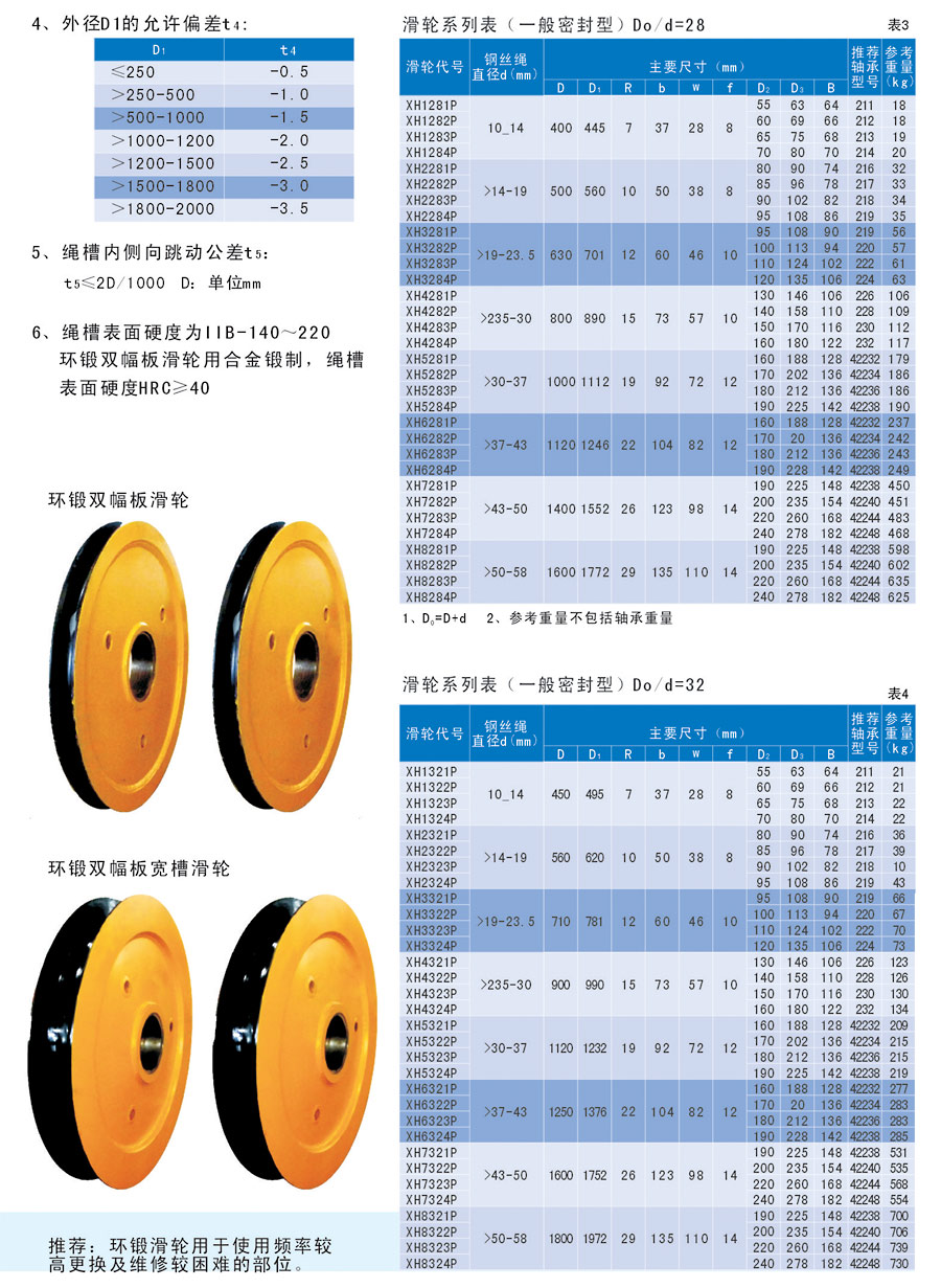滑車按輪數(shù)的多少分為單門滑車,雙門滑車和多門滑車。按滑車與吊物的連接方式可分為吊鉤式滑車,鏈環(huán)式滑車,吊環(huán)式滑車和吊架式滑車四種。一般中小型的滑車多司于吊鉤式、鏈環(huán)式和吊環(huán)式,而大型滑車采用吊環(huán)式和吊梁式。按輪和軸的接觸不同可分為輪軸間裝滑動軸承及滾動軸承兩種。按夾板是否可以打開來分,有開口滑車和閉口滑車。開口滑車的夾板是可以打開的,便于裝繩索,一般的都是單門滑車,它常用于扒桿底腳處作導(dǎo)向滑車用。滑車按使用的方式不同又分為定滑車和動滑車。使用方便,用途廣泛,可以手動,機(jī)動。主要用于工廠、礦山、農(nóng)業(yè)、電力、建筑的生產(chǎn)施工,碼頭、船塢、倉庫的機(jī)器安裝,貨物起吊等。