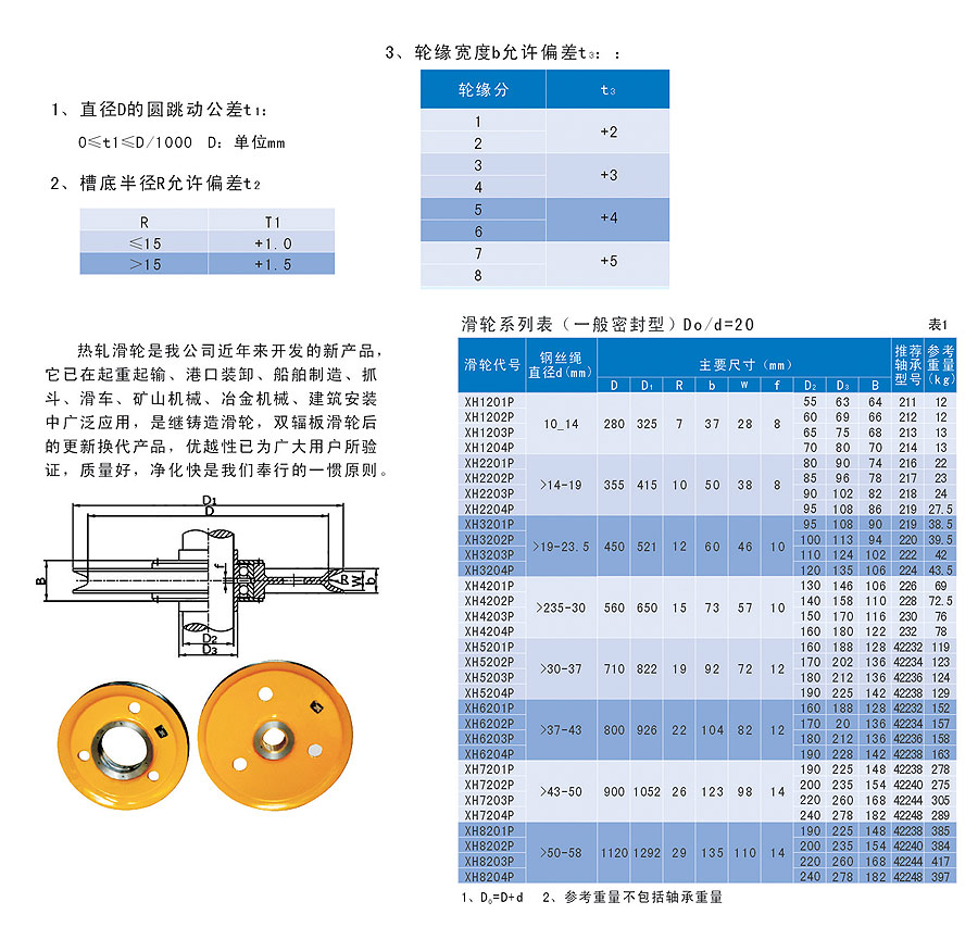 滑車按輪數(shù)的多少分為單門滑車,雙門滑車和多門滑車。按滑車與吊物的連接方式可分為吊鉤式滑車,鏈環(huán)式滑車,吊環(huán)式滑車和吊架式滑車四種。一般中小型的滑車多司于吊鉤式、鏈環(huán)式和吊環(huán)式,而大型滑車采用吊環(huán)式和吊梁式。按輪和軸的接觸不同可分為輪軸間裝滑動(dòng)軸承及滾動(dòng)軸承兩種。按夾板是否可以打開(kāi)來(lái)分,有開(kāi)口滑車和閉口滑車。開(kāi)口滑車的夾板是可以打開(kāi)的,便于裝繩索,一般的都是單門滑車,它常用于扒桿底腳處作導(dǎo)向滑車用。滑車按使用的方式不同又分為定滑車和動(dòng)滑車。使用方便,用途廣泛,可以手動(dòng),機(jī)動(dòng)。主要用于工廠、礦山、農(nóng)業(yè)、電力、建筑的生產(chǎn)施工,碼頭、船塢、倉(cāng)庫(kù)的機(jī)器安裝,貨物起吊等。