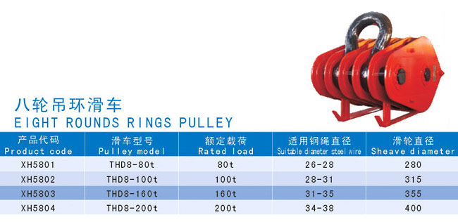 滑車按輪數(shù)的多少分為單門滑車,雙門滑車和多門滑車。按滑車與吊物的連接方式可分為吊鉤式滑車,鏈環(huán)式滑車,吊環(huán)式滑車和吊架式滑車四種。一般中小型的滑車多司于吊鉤式、鏈環(huán)式和吊環(huán)式,而大型滑車采用吊環(huán)式和吊梁式。按輪和軸的接觸不同可分為輪軸間裝滑動軸承及滾動軸承兩種。按夾板是否可以打開來分,有開口滑車和閉口滑車。開口滑車的夾板是可以打開的,便于裝繩索,一般的都是單門滑車,它常用于扒桿底腳處作導(dǎo)向滑車用。滑車按使用的方式不同又分為定滑車和動滑車。使用方便,用途廣泛,可以手動,機(jī)動。主要用于工廠、礦山、農(nóng)業(yè)、電力、建筑的生產(chǎn)施工,碼頭、船塢、倉庫的機(jī)器安裝,貨物起吊等。